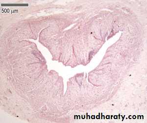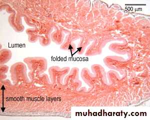 (Fig. 10): Section in urinary bladder demonstrates the folds of mucosa (transitional epithelial tissue) inside the lumen. Note the muscular layer made up of smooth muscles arranged in various directions.