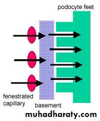 (Fig. 6): The passage of blood out from the fenestrated capillary through the basement membrane into the podocyte, through the feet. These 'feet' interdigitate with those from other podocytes to form filtration slits that are only 20-30 nm wide.