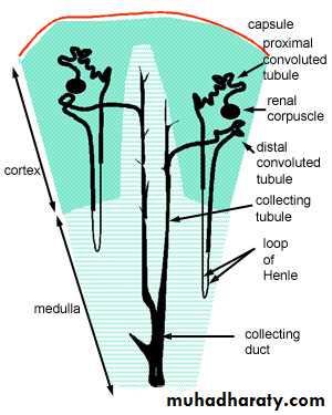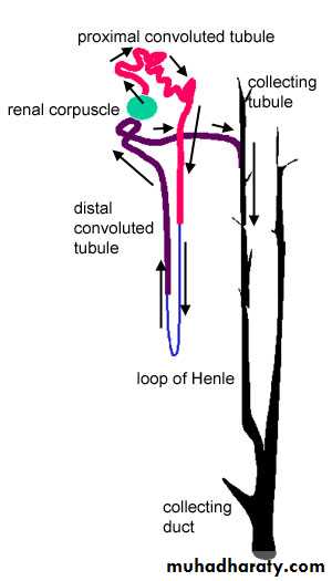 The nephron consists of the renal corpuscle and the renal tubule. The nephron is responsible for filtration, excretion and resorption. It filters out small molecules from plasma, selectively re-absorbs most of the water, and some of the molecules, and also secretes some secretory products into the filtrate. The end product is urine. This schematic diagram shows where the different parts of the nephron are found in the cortex and medulla of the kidney.