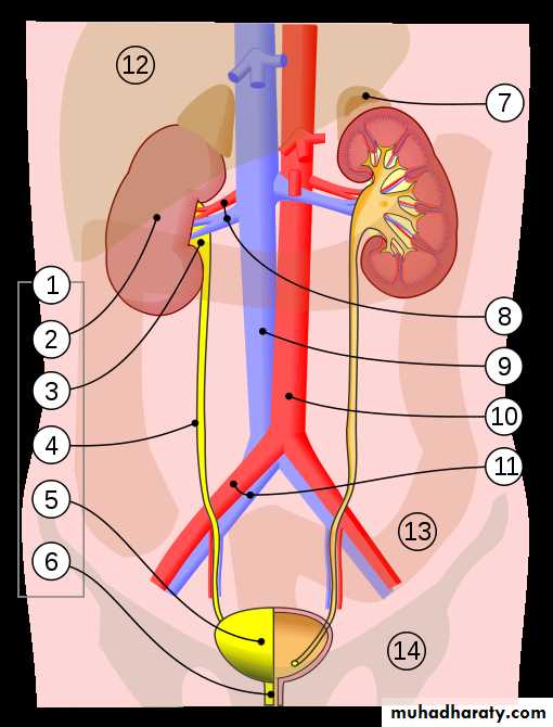 (Fig.1): 1. Human urinary system: shows (2). Kidney, (3). Renal pelvis, (4). Ureter, (5). Urinary bladder, (6). Urethra; (7). Adrenal gland Vessels: (8). Renal artery and vein, (9). Inferior vena cava, (10). Abdominal aorta, (11). Common iliac artery and vein; (12). Liver, (13). Large intestine, (14). Pelvis