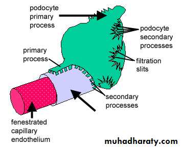 (Fig. 5): A diagram shows how a representative visceral epithelial cell, known as podocytes is wrapped around a capillary because of their unusual shape. Primary processes radiate from the cell body, and form branched secondary processes called podocyte feet that extend onto the basement membrane.
