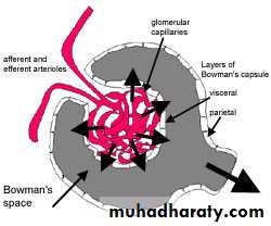 In the first part of the nephron, Bowman's capsule filters blood from the circulatory system into the tubules. Hydrostatic and osmotic pressure gradients facilitate filtration across a semi permeable membrane. The filtrate includes water, small molecules, and ions that easily pass through the filtration membrane. However larger molecules such as proteins and blood cells are prevented from passing through the filtration membrane. The amount of filtrate produced every minute is called the HYPERLINK "https://en.wikipedia.org/wiki/Glomerular_filtration_rate" \o "Glomerular filtration rate" Glomerular Filtration Rate or (GFR) and amounts to 180 litres/day. About 99% of this filtrate is reabsorbed as it passes through the nephron and the remaining 1% becomes urine. The urinary system is regulated by the endocrine system by hormones such as HYPERLINK "https://en.wikipedia.org/wiki/Antidiuretic_hormone" \o "Antidiuretic hormone" antidiuretic hormone, HYPERLINK "https://en.wikipedia.org/wiki/Aldosterone" \o "Aldosterone"aldosterone, and parathyroid hormone.