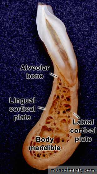• which consist of compact bone and forms the outer (labial) and inner (lingual) plates of the alveolar process. Cortical bone varies in thickness in different areas – it is thicker in the mandible than in the maxilla and thicker in the premolar-molar region than in the anteriors.