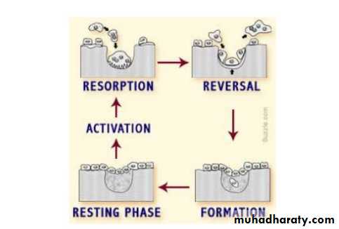 • Resorption: recruitment, migration, and activation of osteaoclasts causing bone resorption.• Reversal: cessation of resorption and disappearance of osteoclasts by apoptosis or migration , the site becomes occupied by mononuclear cells.