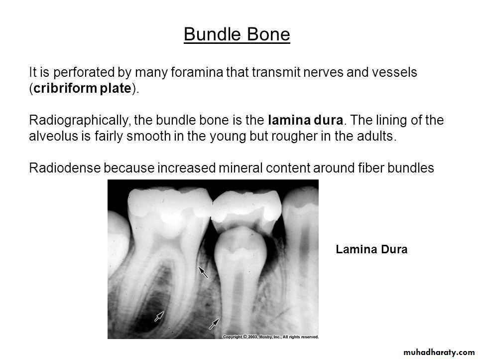 • Radiographically is more radiodense due to presence of thick bone without trabeculations and is called as “lamina dura”