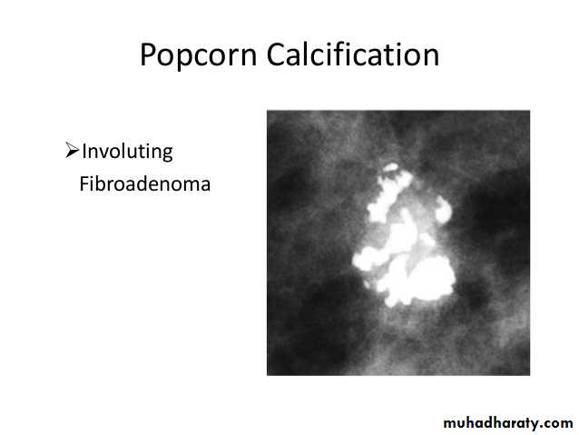 Fibroadenomas have a spectrum of features from the well circumscribed discrete oval mass hypo- or isodense to the breast glandular tissue, to a mass with macrolobulation or partially obscured margin. Involuting fibroadenomas in older, typically postmenopausal patients may contain calcification, often producing the classic, coarse popcorn calcification appearance.
