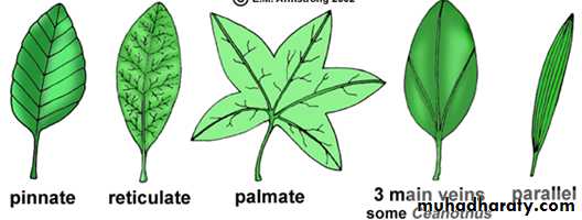 • 1) شبكي كفي متباعد palmately reticulate divergent كما في العنب Vitis والتين Ficus والخروع Ricinus