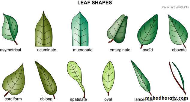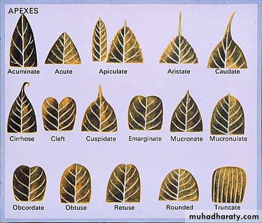 المخرازية subulate، 2.الابرية acicular،3. الشريطية Linear ،ا4.لانبوبية tubular ،5.متطاولة او مستطيلة oblong 5.الرمحية lanceolate 6.رمحية مقلوبة oblanceolate7. الاهليلجية elliptic ،8.البيضوية Ovate بيضوية مقلوبة Obovate ،9. قلبية cordate 10.قلبية مقلوبة obcordate ،11.الملعقية Spatulate ،12.سهمية 13.مضمومة القاعدة Sagittate ،14.المزراقية Hastate ،15.المثلثة Deltoid،16.الدائرية Orbicular، 17.كلوية Reniform ، 18.المشطية Pectinate، 19.سيفي Ensiform ،20.قيثارية Lyratus،21. معينية Rhomboidحاده Acute ،2.المحتدة او المستدقة Acuminate ،3.القمية apiculate ،4.السفاتية Aristate،5. المذنب او الذيلية Caudate ،6.الذيلية المعقوفة Cirrhouse،7. الشوكية او المستدقة الشوكية Cuspidate،8. المهمازية Mucronate،9. المقطوعة Truncate،10. المدورة Rouded = Obtuse،11. المقروضRetuse،12. قلبية مقلوبة Obcordate،13. الغائرة Emarginate