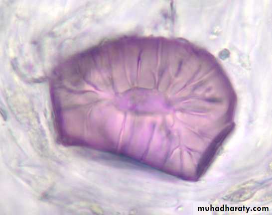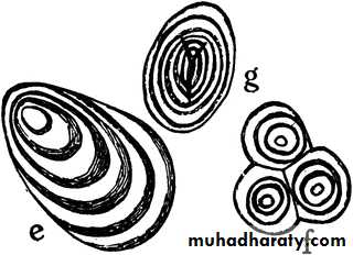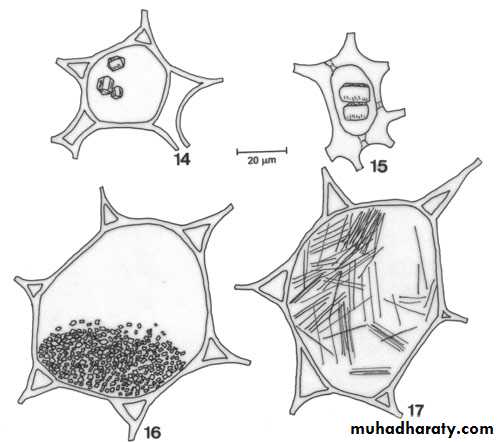 • وفيها يكون جسم البلورة من Body مكونا من كاربونات الكالسيوم اما العنق Stalk فهو مركب من مادة السليلوز ويتدلى من الجدار المماسي لخلايا البشرة بالنسبة لبعض النباتات بينما يتصل طرفه الاخر بالبلورة ويطلق على الخلية الحاوية على البلورة اسم الخلية الحجرية Lithocyte او كيس الحويصلة الحجرية Lithocyst. كما يوجد نوع خاص من البلورات يدعى الكروية Sphaerocrystals وهذا يوجد في درنات نبات الداليا تتركب من مادة الانيولين Inulin وقد تكون بلورات اوكزالات الكالسيوم على شكل مسحوق يشبه الرمل يدعى البلورات الرملية Sand crystals كما في البطاطس.• الحبيبات النشوية Starch grains