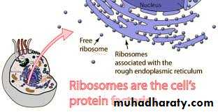 وهي تراكيب على هيئة حبيبات غاية في الدقة يمكن ريتها بالمجهر الالكتروني وتتركب من الحامض النووي rRNA وبروتينات أي انها تمثل بروتينات نووية كما انها تحوي انزيمات خاصة بعمليات البناء وخصوصا بناء البروتين وغالبا ماتكون الرايبوسومات في خلايا حقيقية النواة مقترنة مع الشبكة الاندوبلازمية مكونة الشبكة الاندوبلازمية الخشنة Rough endoplasmic reticulum RER