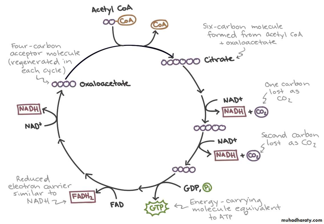 2. Citric acid cycle ( tri-carboxylic acid cycle or Krebs cycle) : it is an aerobic pathway that occur in the matrix of mitochondria to complete breakdown of glucose molecule started by enter the pyruvate molecule as acetyl CoA to produce, 4CO2 + 6 NADH +2 ATP.