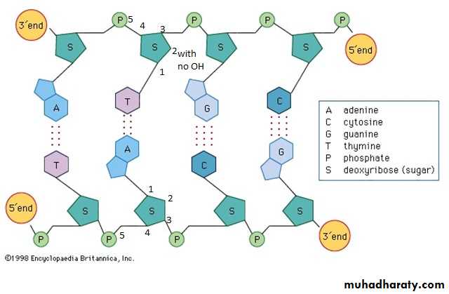 DNAis a very large molecule made up of a long chain of subunits. It is a polymer of two strands of nucleotides with a hydrogen bounded to each other to form a double helix. The sugar is called deoxyribose because there is no hydroxyl (OH) at position 2(just two hydrogen).The phosphate, sugar and one base called a nucleotide, The sugar and base alone are called a nucleoside. The phosphodiesters backbone are held between phosphate group and sugar, the base pairs are held together by hydrogen bonds to form (complementary base pairing).
