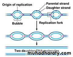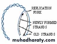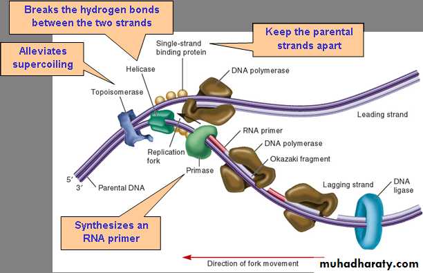 The replication begins with separation of the two DNA strand to form two of parent strand at origin of replication (replication fork). Both strands start together but one of them start by continuous orientation from 3'-5' this strand called leading strand. While the other strand start by discontinuous orientation from 5'-3' this strand called lagging strand, in which the replication occur as a segments by forming an okazaki fragments, primase is used to add a primers at the head of 5' end. In the prokaryotes, there are several enzymes involved in this process: