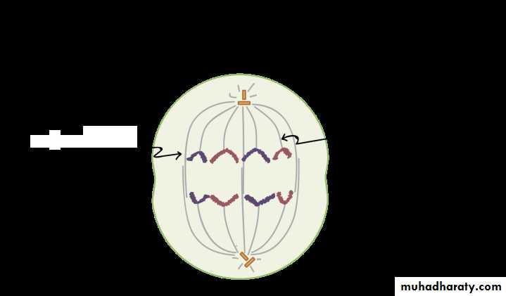 In each of the two daughter cells the chromosomes (pair of sister chromatids) line up end-to-end along the equator of the cell.