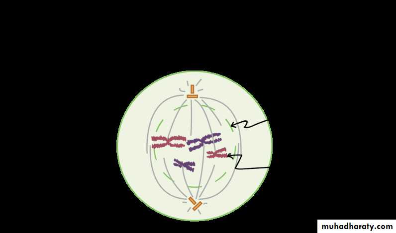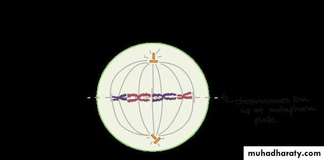 The chromosomes line up neatly end-to-end along the center (equator) of the cell. The centrioles are now at opposite poles of the cell with the mitotic spindle fibers extending from them.The mitotic spindle fibers attach to each of the sister chromatids.