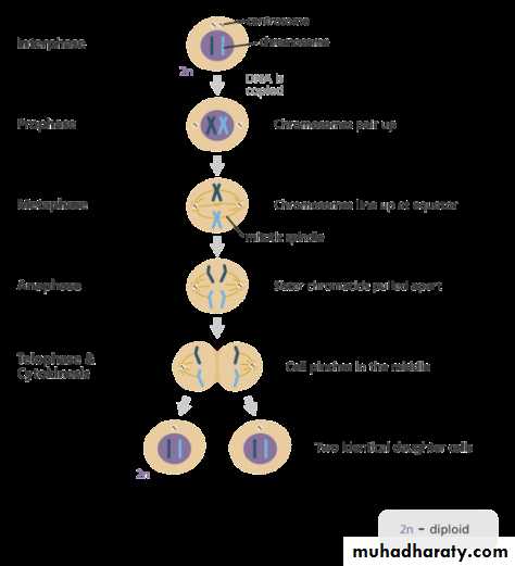 MitosisMitosis is a process where a single cell divides into two identical daughter cells (cell division). During mitosis one cell divides once to form two identical cells and the DNA of the cell's nucleus is split into two equal sets of chromosomes.. The major purpose of mitosis is for growth and to replace worn out cells with new ones.