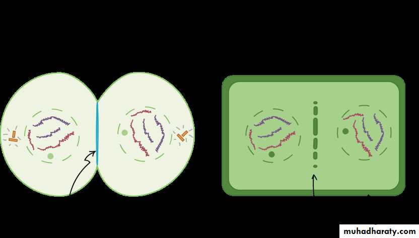 In animal cells, cytokinesis is contractile, pinching the cell in two like a coin purse with a drawstring. The “drawstring” is a band of filaments made of a protein called actin, and the pinch crease is known as the cleavage furrow. Plant cells can’t be divided like this because they have a cell wall and are too stiff. Instead, a structure called the cell plate forms down the middle of the cell, splitting it into two daughter cells separated by a new wall.