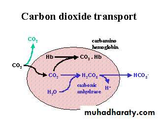 CO2(60-85%) combines with H2O to form carbonic acid (H2CO3), this reaction is catalyzed by the enzyme carbonic anhydrase (CA) which is found in RBC’s. Carbonic acid then dissociates to form bicarbonate ions (HCO3-) and hydrogen ions (H+). Bicarbonate ions release into the blood stream through protein channels in the RBCs wall then the CL- will enter to the RBCs for electrolytes equilibrium, this process called chloride shift.