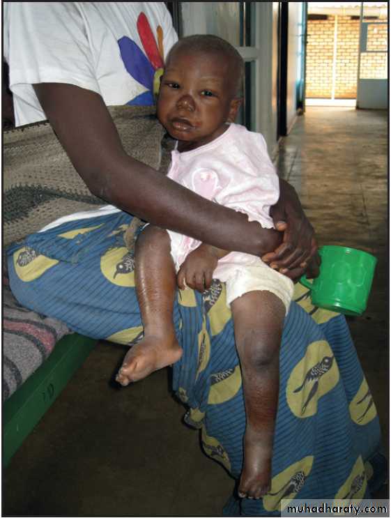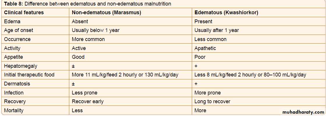 Kwashiorkor is another manifestation of severe protein malnutrition in which there is generalised oedema as well as severe wasting.Because of the oedema, the weight may not be as severely reduced. In addition, there may be: