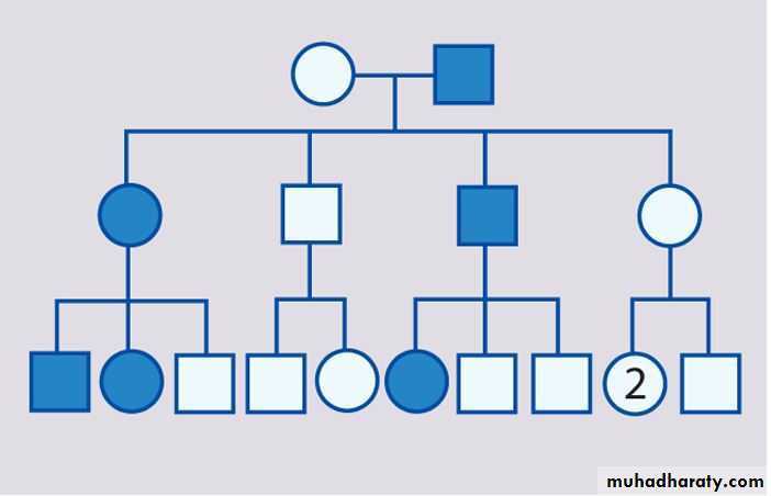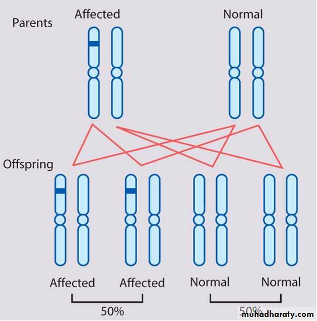 Male and female offspring each have a 1 in 2 (50%) chance of inheriting the abnormal gene from an affected parent