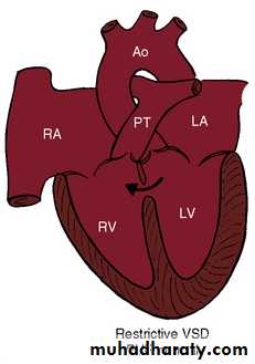 When a small communication is present (usually <0.5 cm2), the VSD is called restrictive and right ventricularpressure is normal.