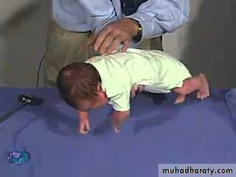 A newborn has head lag on pulling to sitting position. In ventral suspension, the head and the limbs are flexed.Head Lag