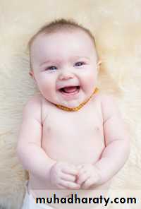 The baby regards faces by 1 month, has social smile by 6 weeks and recognizes the mother and caretakers by 3 months, can laugh loudly by 4 months.