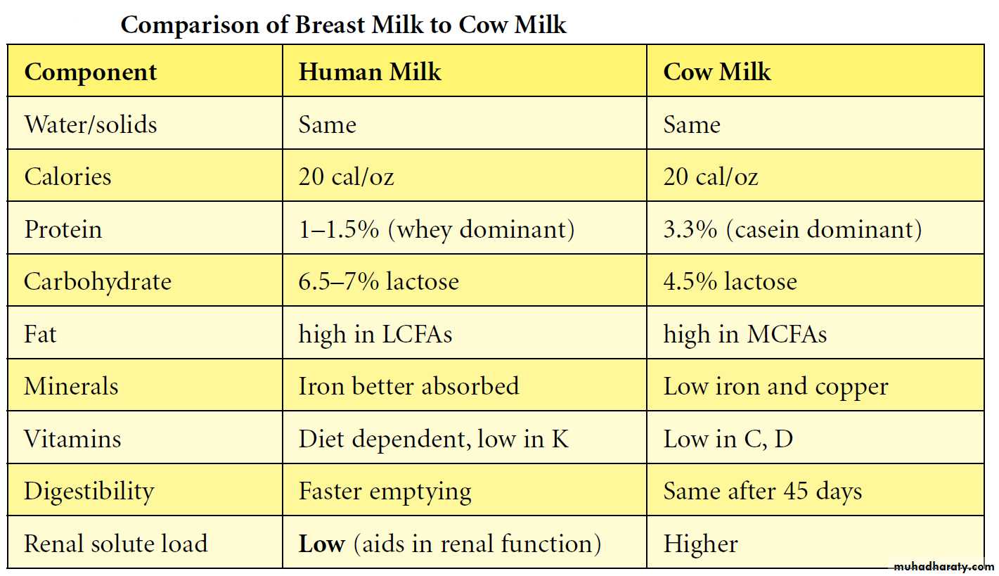 3. Comparison between breast milk and cow’s milk regarding composition, nutritional outcome, complications,& preparation of formula.
