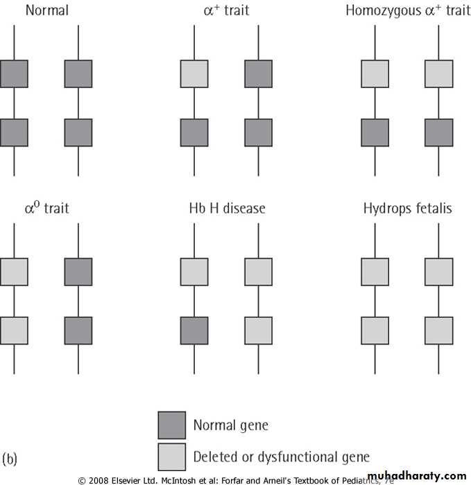 1-α-thalassemia major: 4 genes deleted (Hb Bart ) , Hydrops fetalis/death in utero .
