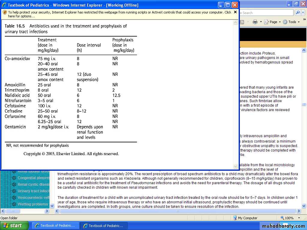 Children with high fever or other manifestations of acute pyelonephritis often are hospitalized for initial treatment with parenteral antibiotics as cefotaxime and gentamicin or another aminoglycosid. Then after initial improvement therapy can be continued orally for a total of 14 days