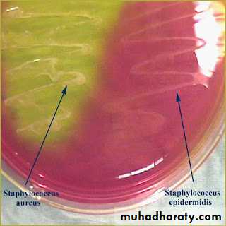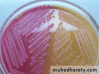 Blood agar (various kinds of hemolysis i.e. α, β and γ hemolysis)Mac Conkey agar (lactose fermenters, Pink colonies whereas non- lactose fermenter produces pale or colorless colonies.