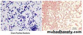 11. Blot dry with bibulous paper and examine under oil immersion. Gram-positive organisms stain blue to purple ( example :Staphylococcus aureus) ; gram-negative organisms stain pink to red ( example Escherichia coli). There is no need to place a coverslip on the stained smear.
