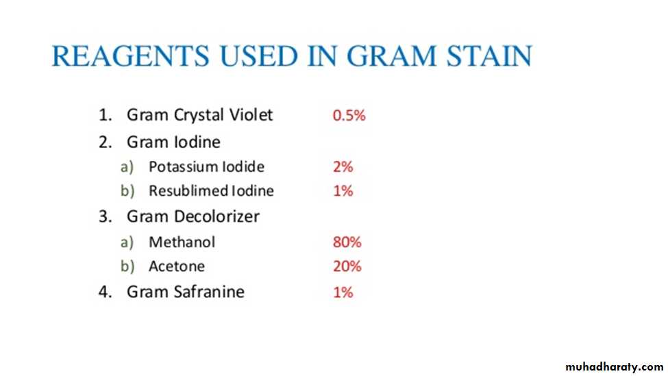 Principle of Gram Stain:In aqueous solutions crystal violet dissociates into CV+ and Cl – ions that penetrate through the wall and membrane of both gram-positive and gram-negative cells. The CV+ interacts with negatively charged components of bacterial cells, staining the cells purple.