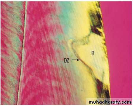 1-the zone of destruction: following exposure of dentine to the mass of bacteria in the cavity, the most superficial part of the dentine is decomposed by the action of acids and proteolytic microorganisms.2-the zone of penetration: tubular invasion of bacteria is frequently seen beneath the first zone.