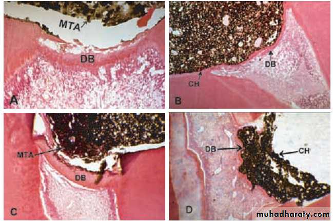 MTA was introduced to endodontics by Lee et al. in the early 1990s. This bioactive silicate cement was originally composed of tricalcium silicate, tricalcium aluminate, tricalcium oxide, silicate oxide, and other mineral oxides. Originally a gray powder, white MTA was produced for esthetic reasons.Comparison of dentin bridge formation using mineral trioxide aggregate (MTA) or calcium hydroxide in dog pulps.A,After 1 week, a noticeable bridge has formed subjacent to MTA.B,A comparable bridge under calcium hydroxide after 2 weeks.C,A 4-week specimen with MTA shows excellent bridge formation.D,Consistently, the bridge formation under calcium hydroxide lagged behind MTA; an example of bridge formation under calcium hydroxide after 8 weeks. CH = calcium hydroxide; DB = dentin bridge; MTA = mineral trioxide aggregate.