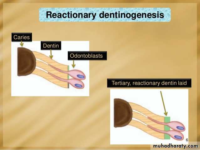 Tertiary dentin is dentin formed as a reaction to external stimulation such as cavities. It is of two types, either reactionary, where dentin is formed from a pre-existing odontoblast, or reparative, where newly differentiated odontoblast-like cells are formed due to the death of the original odontoblasts, from a pulpal progenitor cell. Tertiary dentin is only formed by an odontoblast directly affected by a stimulus; therefore, the architecture and structure depend on the intensity and duration of the stimulus, e.g., if the stimulus is a carious lesion, there is extensive destruction of dentin and damage to the pulp, due to the differentiation of bacterial metabolites and toxins. Thus, tertiary dentin is deposited rapidly, with a sparse and irregular tubular pattern and some cellular inclusions; in this case it is referred to as "osteodentin". However, if the stimulus is less active, it is laid down less rapidly with a more regular tubular pattern and hardly any cellular inclusions.