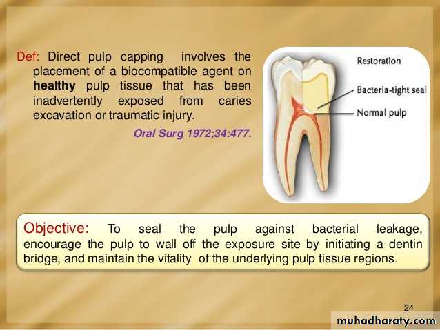 Sedative Material placed over exposed or nearly exposed pulp1)crown 2)root 3)Restoration 4)pulp capp 5) pulp chamber.
