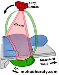 • In helical CT a circular gantry holding the X-ray tube on one side and detectors on the other rotates continuously as the patient passes through.
