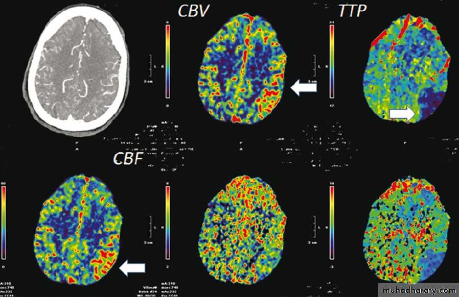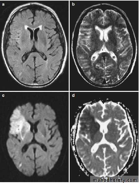 • Diffusion-weighted imaging (DWI) is sensitive to the random Brownian motion (diffusion) of water molecules within tissue. The greater the amount of diffusion, the greater the signal loss on DWI. Areas of reduced water molecule diffusion show on DWI as relatively high signal. Diffusion-weighted imaging is the most sensitive imaging test available for the diagnosis of acute cerebral infarction, epidermoid cyst and abscess.• Perfusion-weighted imaging (PWI) may be used in patients with cerebral infarct to map out areas of brain at risk of ischemia that may be salvageable with thrombolysis.