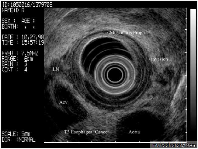 • Endoscopic US (EUS): assessment of tumors of the upper gastrointestinal tract and pancreas
