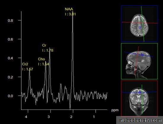 • Magnetic resonance spectroscopy (MRS) uses different frequencies to identify certain molecules in a selected volume of tissue, known as a voxel. Following data analysis, a spectrographic graph of certain metabolites is drawn. Metabolites of interest include lipid, lactate, NAA (N-acetylaspartate), choline, creatinine, citrate and myoinositol. Uses of MRS include characterization of metabolic brain disorders in children, imaging of dementias, differentiation of recurrent cerebral tumor from radiation necrosis, and diagnosis of prostatic carcinoma.