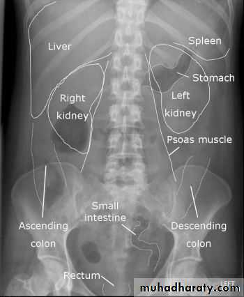 Relatively large amounts of gas are usually present in the stomach and colon.The stomach can be readily identified by it's location, gastric rugae in the supine view and by the air fluid level beneath the left hemidiaphragm in the erect view