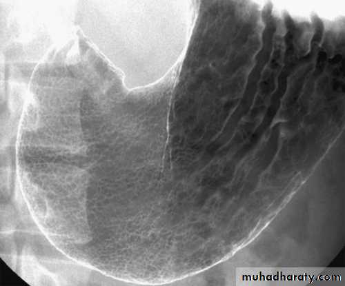 Mucosal pattern : the normal mucosa of stomach and SB is thrown into folds, whereas mucosa of colon and rectum is smooth. Diseased mucosa may be abnormally smooth or abnormally irregularUlceration: an ulcer is a breach of a mucosal surface that becomes visible when the crater contains barium.