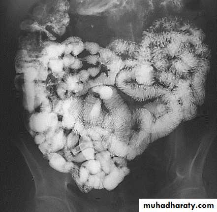 • Normal mucosa exhibit a feathery appearance [Valvulae conniventes].