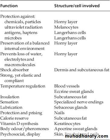 The skin is liberally supplied with an estimated 1 million nerve fibres. Most are found in the face and extremities. Their cell bodies lie in the dorsal root ganglia. Both myelinated and non-myelinated fibres exist, with the latter making up an increasing proportion peripherally. Most free sensory nerves end in the dermis; however, a few non-myelinated nerve endings penetrate into the epidermis. Some of these are associated with Merkel cells. Free nerve endings detect the potentially damaging stimuli of heat and pain (nocioceptors), while specialized end organs in the dermis, Pacinian and Meissner corpuscles, register deformation of the skin caused by pressure (mechanoreceptors) as well as vibration and touch. Autonomic nerves supply the blood vessels, sweat glands and arrector pili muscles. Itching is an important feature of many skin diseases. It follows the stimulation of fine free nerve endings lying close to the dermo-epidermal junction .Areas with a high density of such endings (itch spots) are especially sensitive to itch-provoking stimuli. Impulses from these free endings pass centrally in two ways: quickly along myelinated A fibres, and more slowly along non-myelinated C fibres. As a result, itch has two components: a quick localized pricking sensation followed by a slow burning diffuse itching. Many stimuli can induce itching (electrical, chem-ical and mechanical). In itchy skin diseases, pruritogenic chemicals such as histamine and proteolytic enzymes are liberated close to the dermo-epidermal junction.