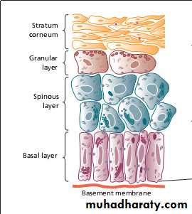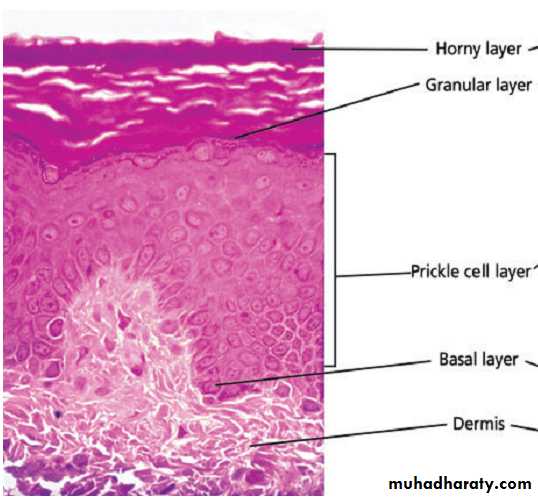 The granular layer, consists of two or three layers cells are flatter than those in the spinous layer,have more tonofibrils.