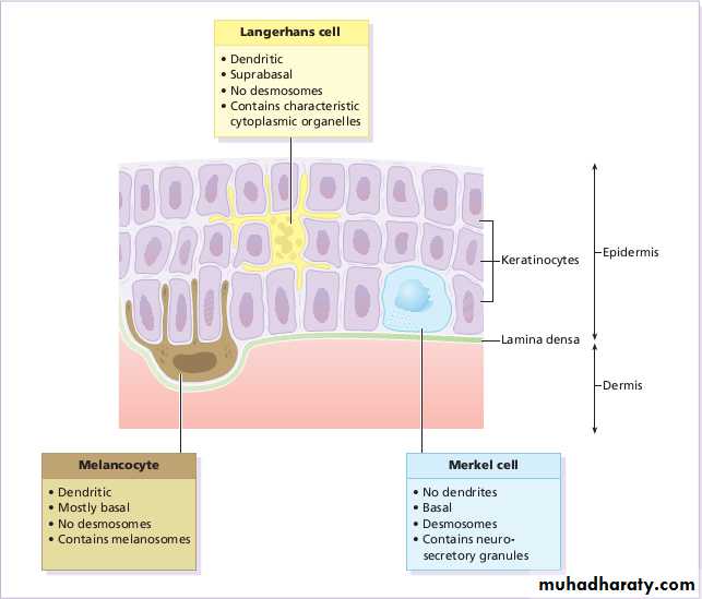 dendritic cell like the melanocyte.lacks desmosomes,tonofibrils, has a lobulated nucleus.