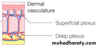 Afferent lymphatics begin as blind-ended capillaries in the dermal papilla, pass to superficial lymphatic plexus in papillary dermis then two deeper horizontal plexuses, collecting lymphatics run with the veinsNerves