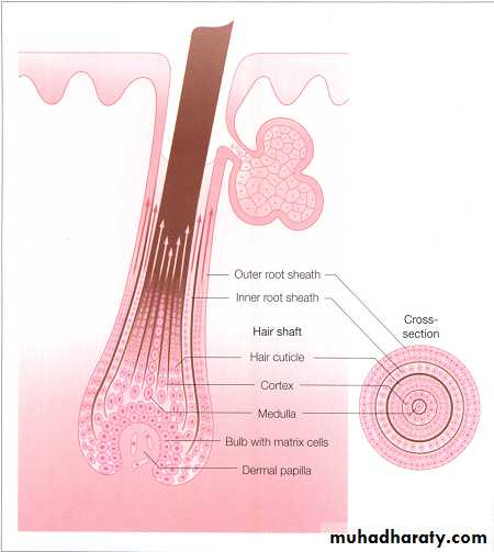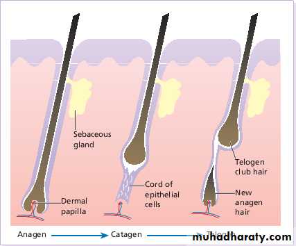 3.Terminal hairs: Long coarse medullated hairs scalp or pubic regions. growth influenced by androgen