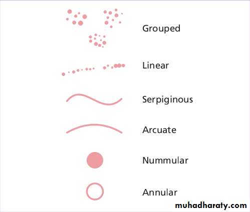 Arrangements and configurations can be as discrete, confluent, grouped, annular, arcuate, segmental or dermatomal .Individual lesions may be annular, several individual lesions may arrange themselves into polycyclic configuration.